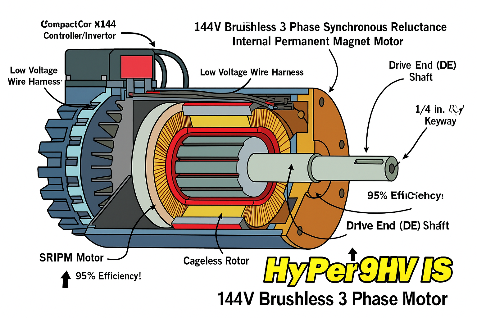 - The HyPer 9 Integrated System™ (IS) is the ideal power-train for any light to mid-weight daily driver. Combine multiple systems for heavy-weight and racing vehicles. Its Synchronous Reluctance Internal Permanent Magnet (SRIPM) platform delivers outstanding torque and efficiency, generating higher power per pound than any other motor in its class. The HyPer 9HV IS™ includes the 144V brushless HyPer 9™ Motor, HyPer-Drive X144™ Controller/Inverter, Low Voltage Wire Harness, and Main Contactor. This system has many unique features that set it apart from any other EV solution on the market.